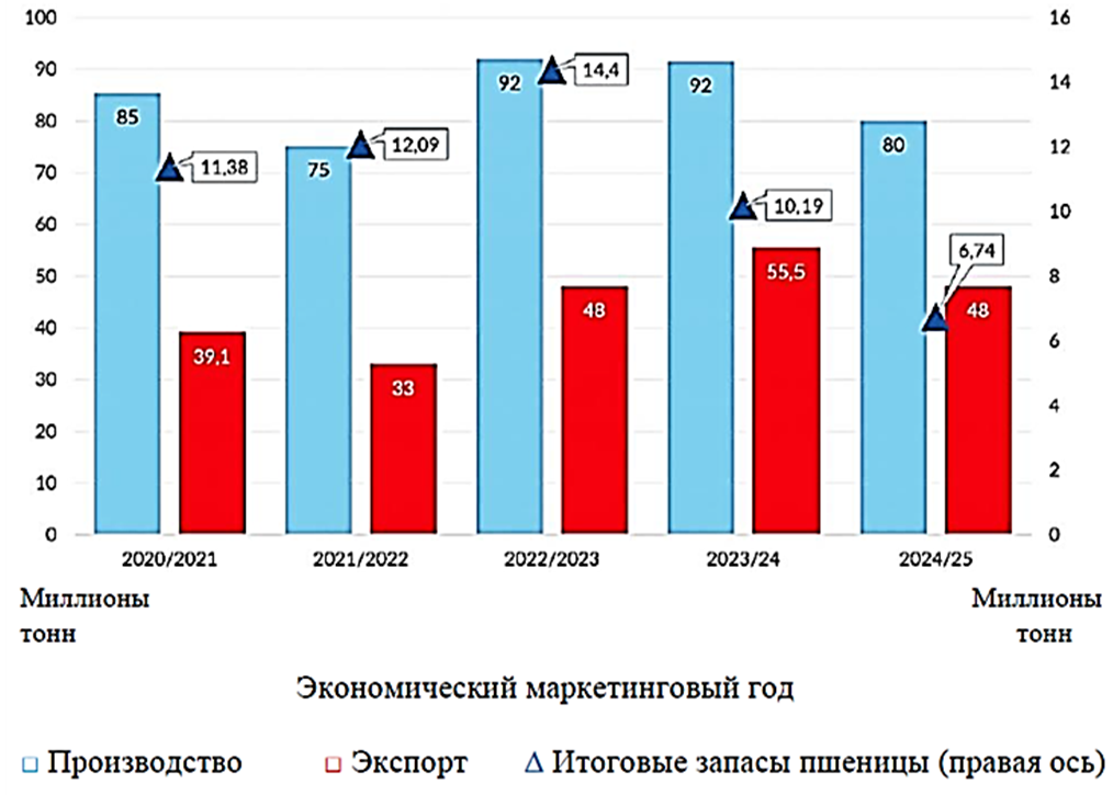 Рис. 1. Динамика производства, экспорта и конечные запасы пшеницы в России в млн. тонн, (2020 ‒ 2025 гг.) [1]