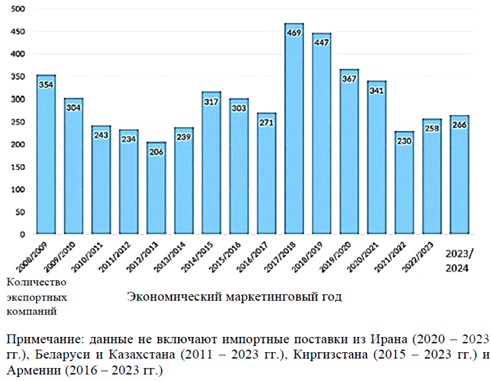 Рис. 3. Количество экспортных компаний в экономическом маркетинговом году (2008 – 2024 гг.) [2]