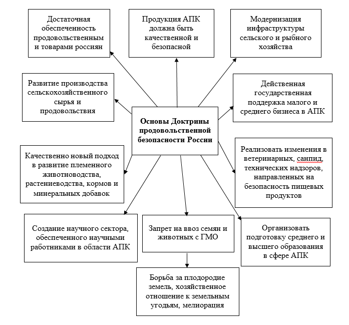 Стратегически спланированная Доктрина продовольственной безопасности РФ отражает основные задачи государственной экономико-социальной политики страны. Понятие продовольственной безопасности РФ- характеризуется устойчивым экономическим и социальным развитием страны, где основным показателем является продовольственная независимость РФ. Страна при этом обеспечивает гарантии каждому гражданину в части доступности пищевой продукции, которая соответствующего качества и не меньше утвержденных норм потребления для жизни.