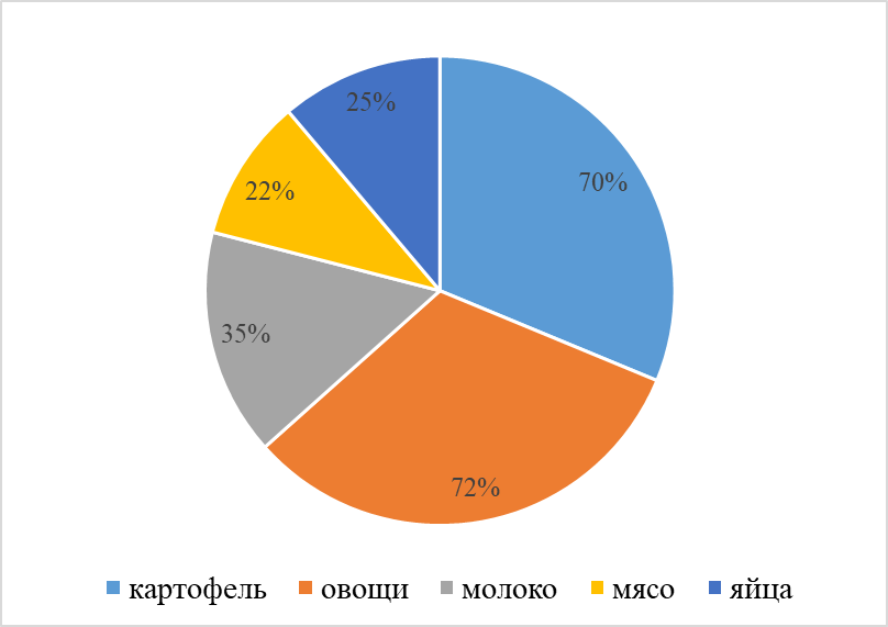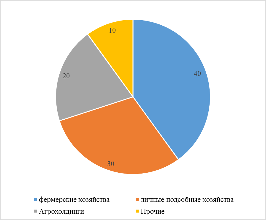 На рисунке 4 «Удельный вес личных подсобных хозяйств в производстве сельскохозяйственной продукции в целом за 2024 год» наглядно видно, что произведенная сельскохозяйственная продукция ЛПХ занимает 30 % от общего производства другими организациями страны, при этом обогнав агрохолдинги на 10% и всего уступив крестьянским (фермерским) хозяйствам 10 %.
