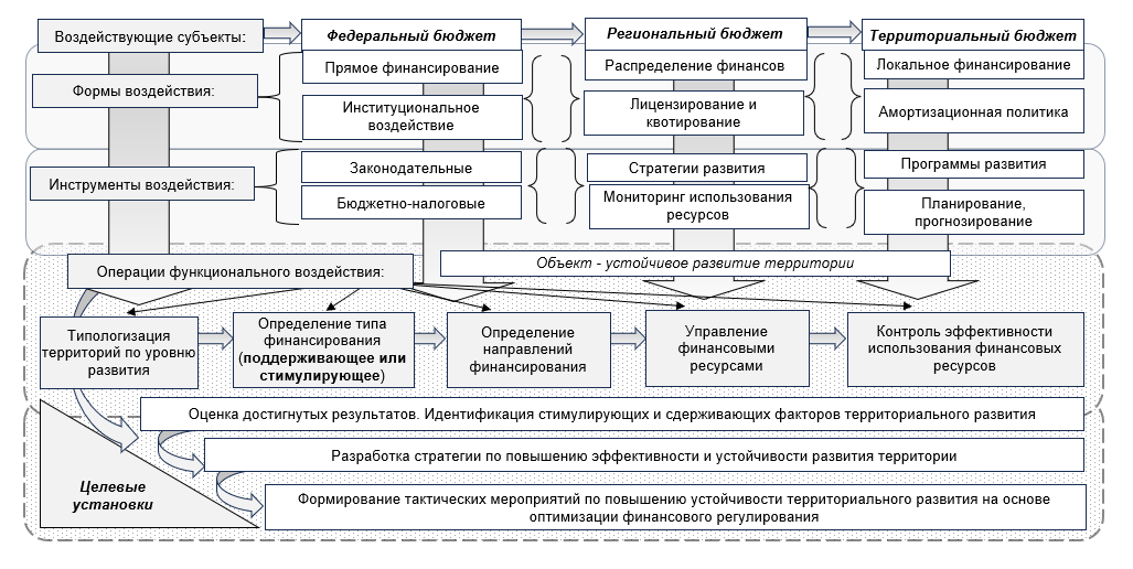 В представленном механизме взаимодействие уровней бюджета осуществляется посредством применения воздействующих форм и инструментария, направленных на обеспечение устойчивости территориального развития. Такое системное уровневое взаимодействие позволяет сформировать единую финансовую политику как центра, так и субъекта, и отдельной территории в части достижения общего целеполагания. Следует отметить, что инструменты, сформированные на федеральном уровне, на нижестоящих уровнях продолжают свое функциональное развитие посредством адаптации к территориальным условиям.