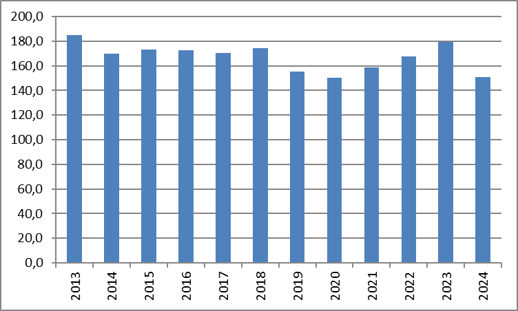 Рис. 2. Объём средств, направленных на поддержку программ и мероприятий развития сельского хозяйства в Российской Федерации в 2013-2024 гг., млрд руб. [9]