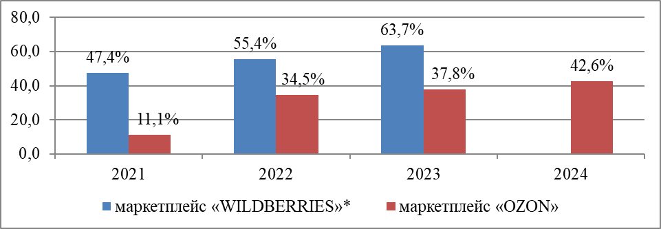 Рис. 2. Удельный вес коммерческих расходов в общей сумме операционных расходов маркетплейсов «OZON» и «WILDBERRIES» за 2021-2024 гг., в %